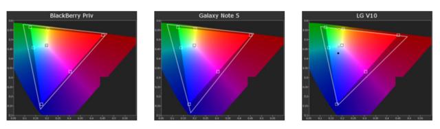 而如果對一些AMOLED屏幕手機(jī)和一些LCD屏幕手機(jī)進(jìn)行一下詳細(xì)檢測的話,也能看出一些差別。比如屏幕雖然都來自三星,但黑莓Priv和Galaxy Note 5的色域范圍仍然稍有差別,而與使用LCD屏幕的LG V10的區(qū)別就更加明顯。不難看出,除了屏幕本身的材質(zhì)之外,各家廠商的調(diào)校對屏幕色彩也有影響。