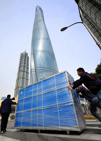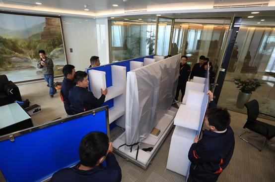 樂視120吋電視uMax120進(jìn)駐上海中心裝有樂視uMax120的藍(lán)色貨箱被售后人員推向上海中心大廈(上海中心一座超高層地標(biāo)式摩天大樓,建筑主體為118層,總高為632米,是上海第一高樓,在世界排名第四)。