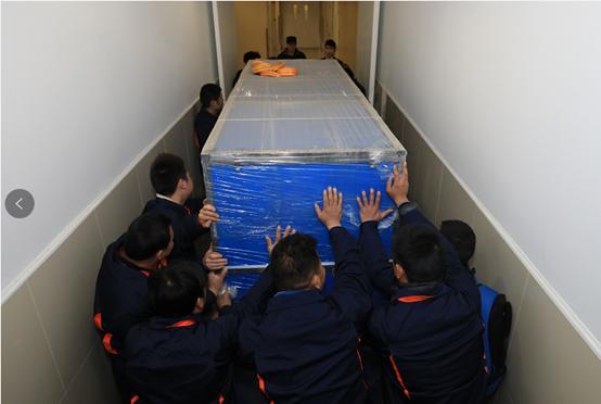 這么沉的貨箱十幾位售后人員齊心將其運(yùn)過狹窄的通道,在通過安全門的地方最高處和貨箱間的縫隙還不到一拳的距離,這種作業(yè)也絕對(duì)是厘米級(jí)的了。